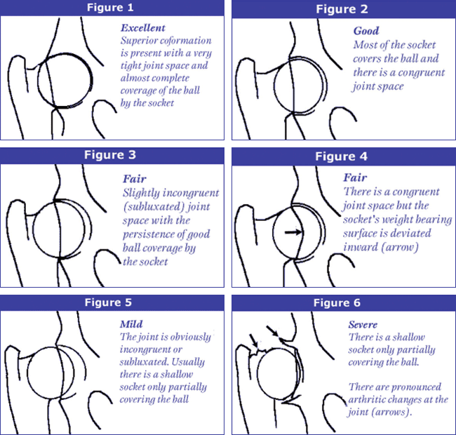 Grado B (HD 1 / HD +/-) | Articolazione dell'anca quasi normale. La testa del femore e l'acetabolo appaiono leggermente incongruenti. |