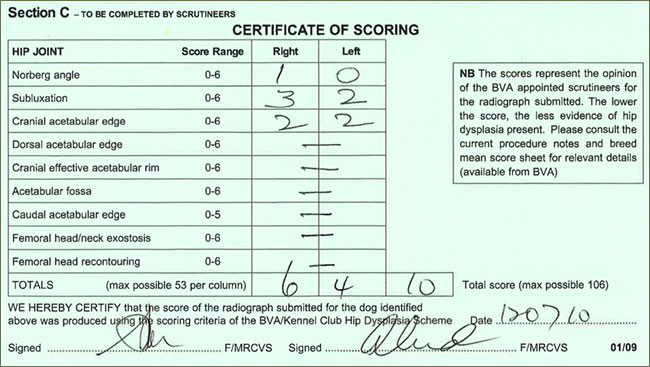 BVA (British Veterinary Association, Inghilterra) usa un metodo quantitativo di identificazione della displasia dell'anca: il sistema Willis. La lettura della radiografia con il metodo Willis si avvale della suddivisione del complesso articolare in 9 parametri. Ogni parametro esamina le singole articolazioni (destra e sinistra), assegnando un grado di gravità che va da 0 ad un massimo di 6, ad eccezione del parametro 7 che va da 0 a 5. Un punteggio alto indica un'anca in cattive condizioni e lo 0 è segno di assoluta sanità. Il massimo di gravità totale è di 53 punti per anca. Il risultato relativo alle due anche viene indicato con due numeri separati (es.: hipscore 3/1).